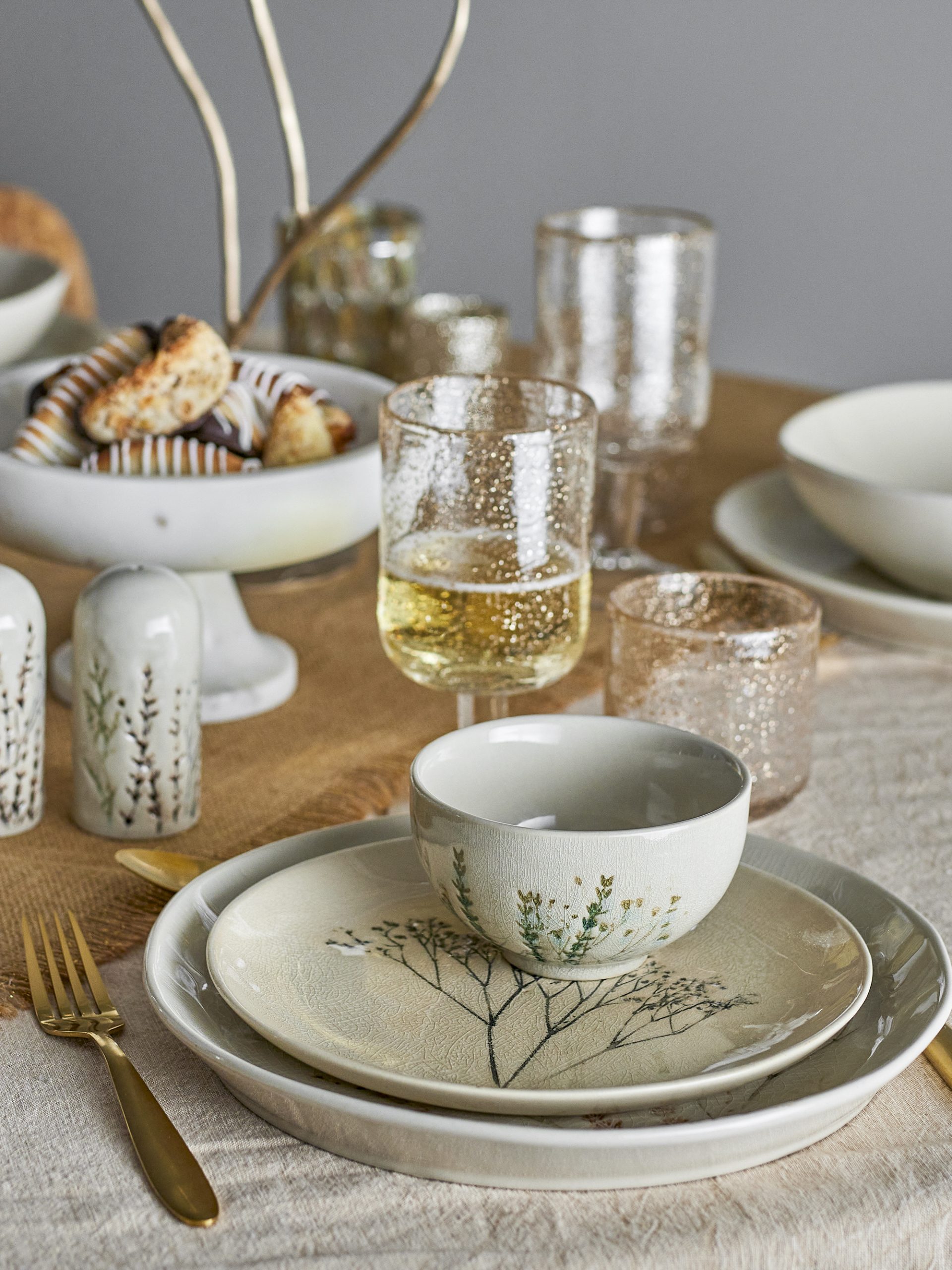 Set posuđa Bea iz Bloomingvillea ima nježan ručno oslikan cvjetni dizajn, što ga čini elegantnim setom prikladnim i za svakodnevnu upotrebu i za posebne prigode. Fini, napukli dizajn dodaje teksturalnu dimenziju bež bazi. Ručno oslikani detalji osiguravaju da je svaki komad u kolekciji jedinstven, dodajući osobni pečat vašoj postavci stola. Set uključuje: 4 x zdjele (D11xV6,5), 4 x tanjura (D22) i 4 x tanjura (D27,5 cm). Set od 12 komada.