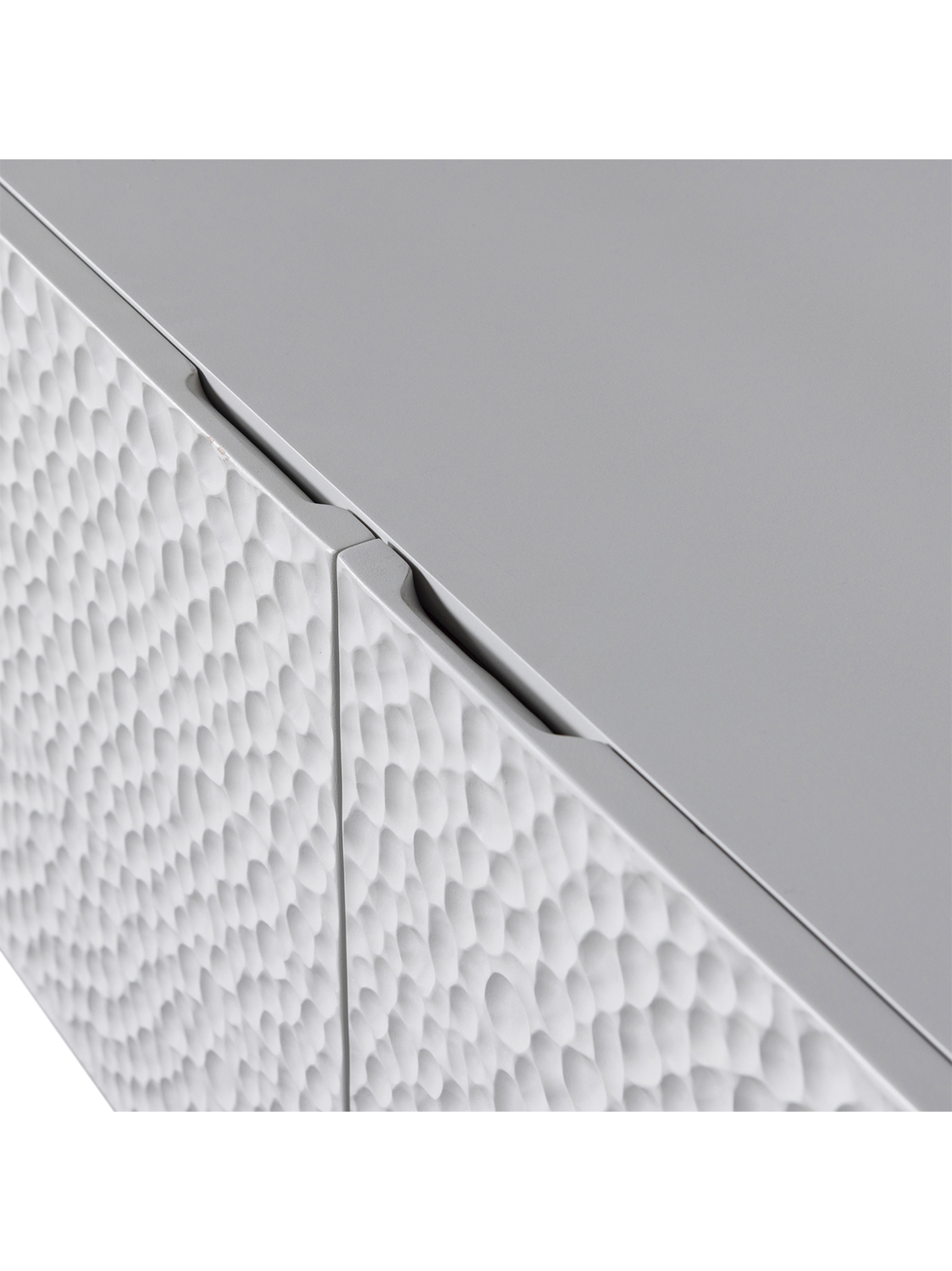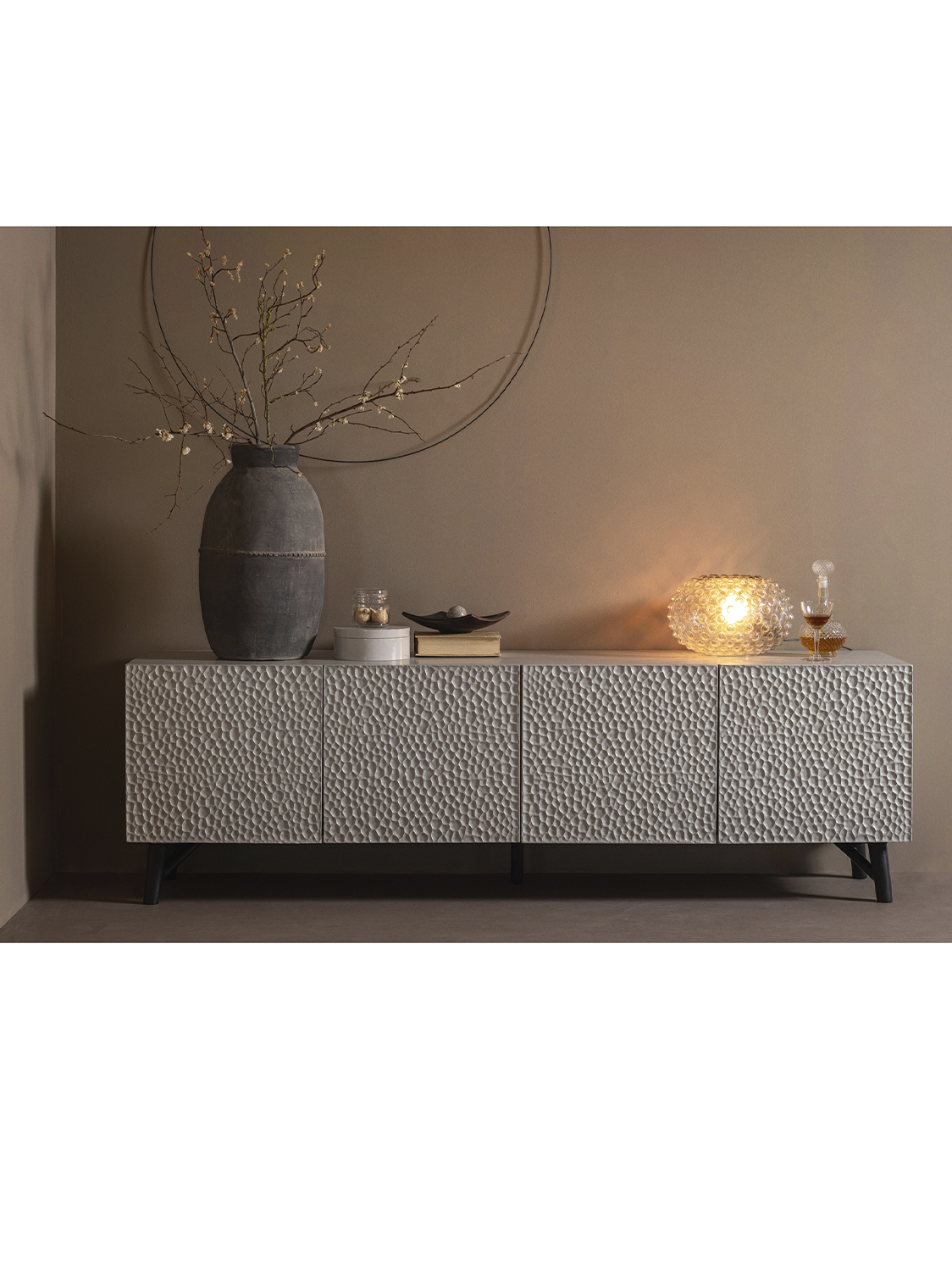 Orijentalna umjetnost obrade drveta stvara umjetnički dizajn koji ovu komodu čini lijepim, praktičnim i osebujnim komadom namještaja.Dizajn podsjeća na valoviti pustinjski krajolik u minijaturi. Ovaj zanimljivi oblik daje lijep 3D efekt na vratima, koji je ujedinjen mekom magličastom bojom.