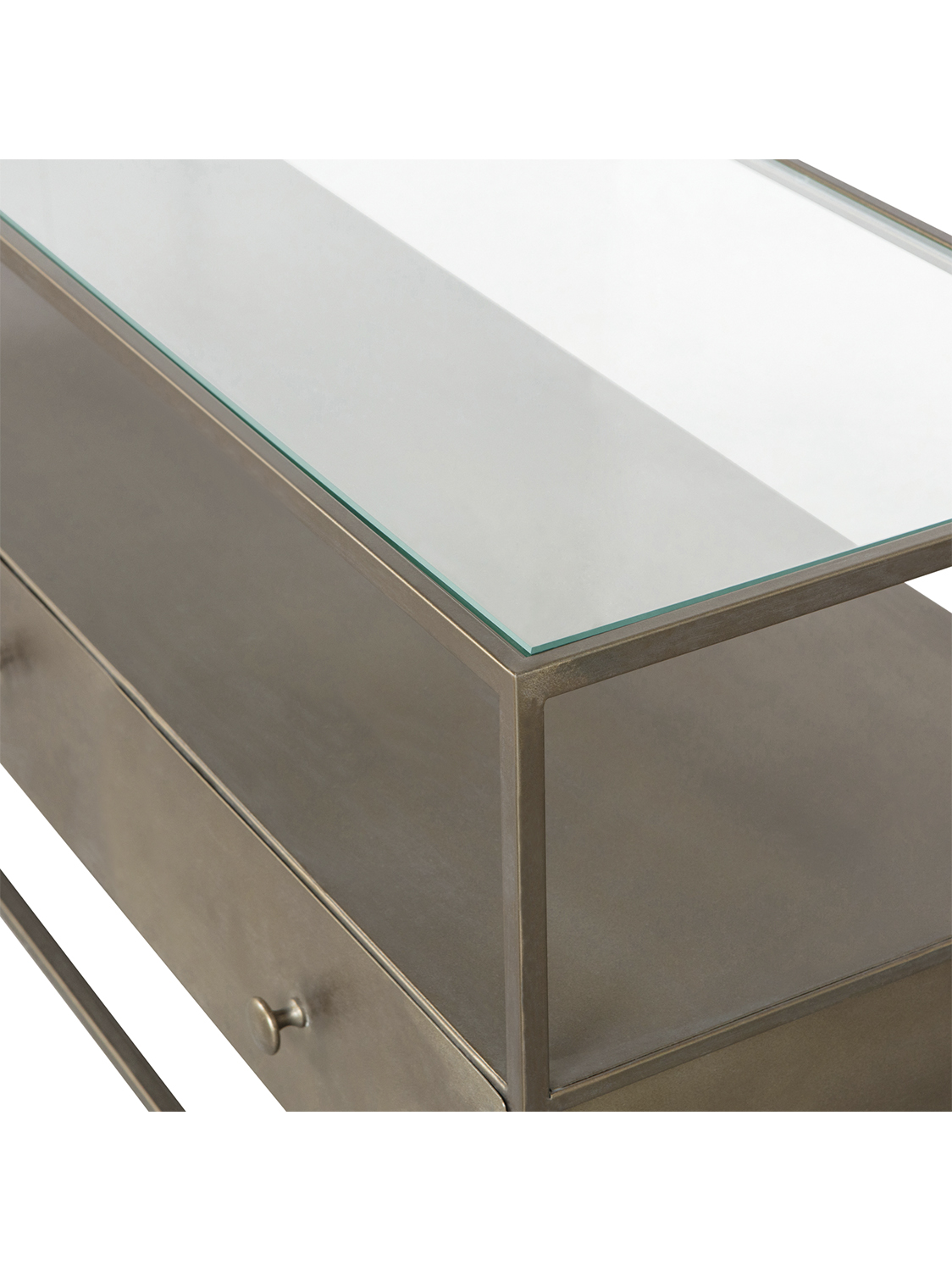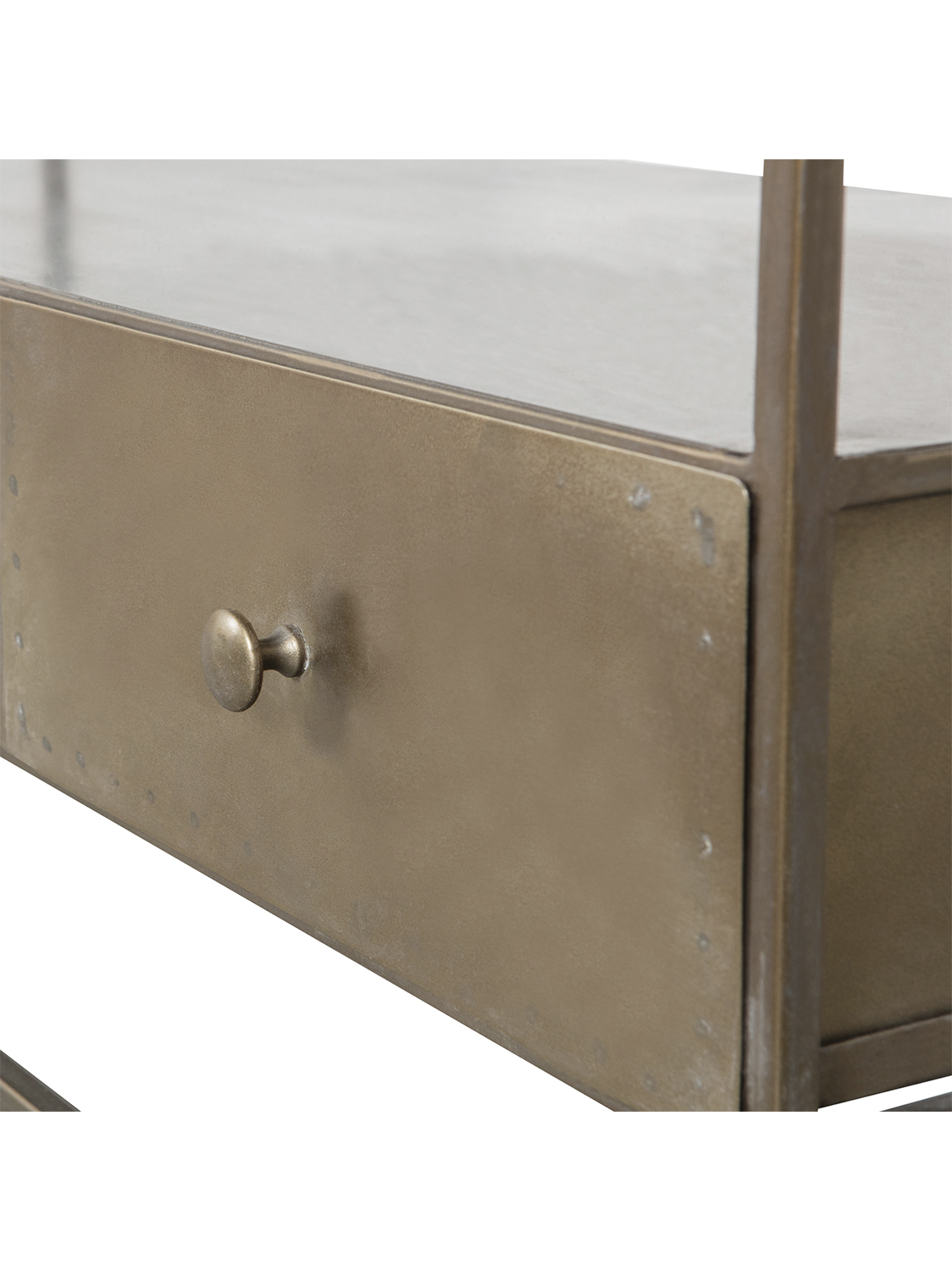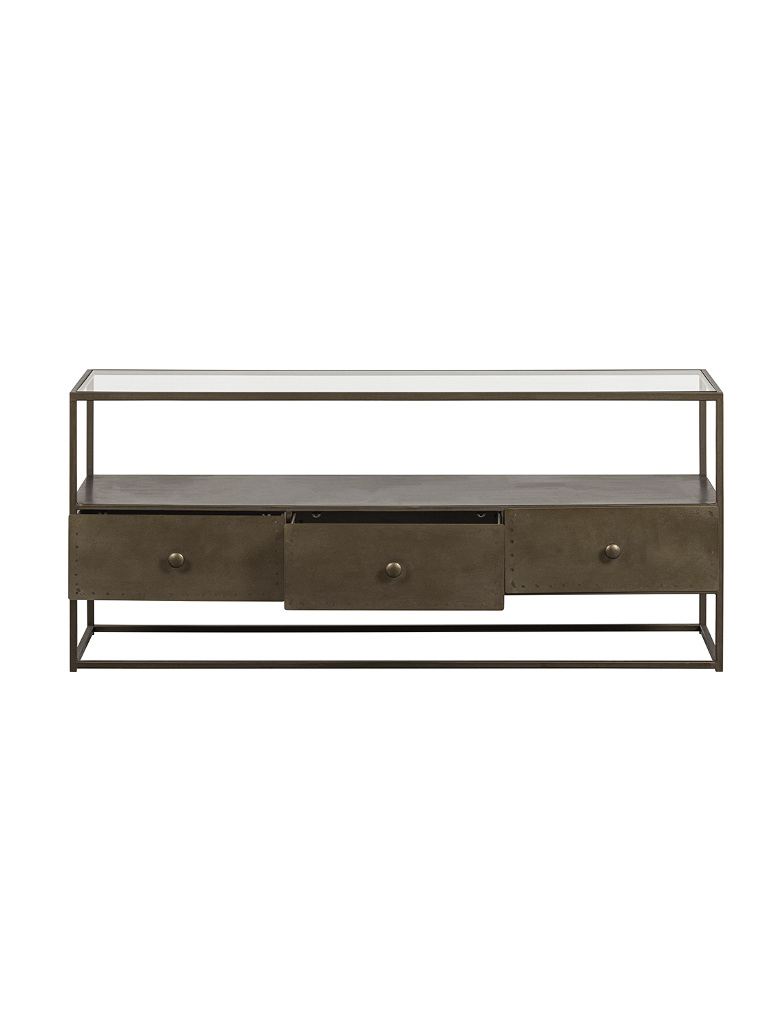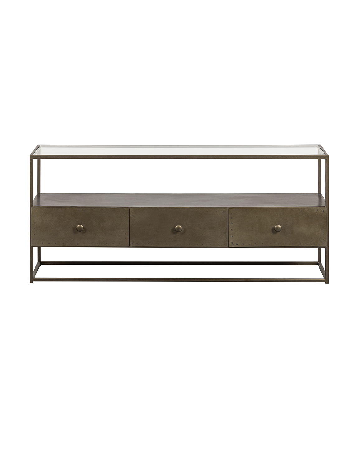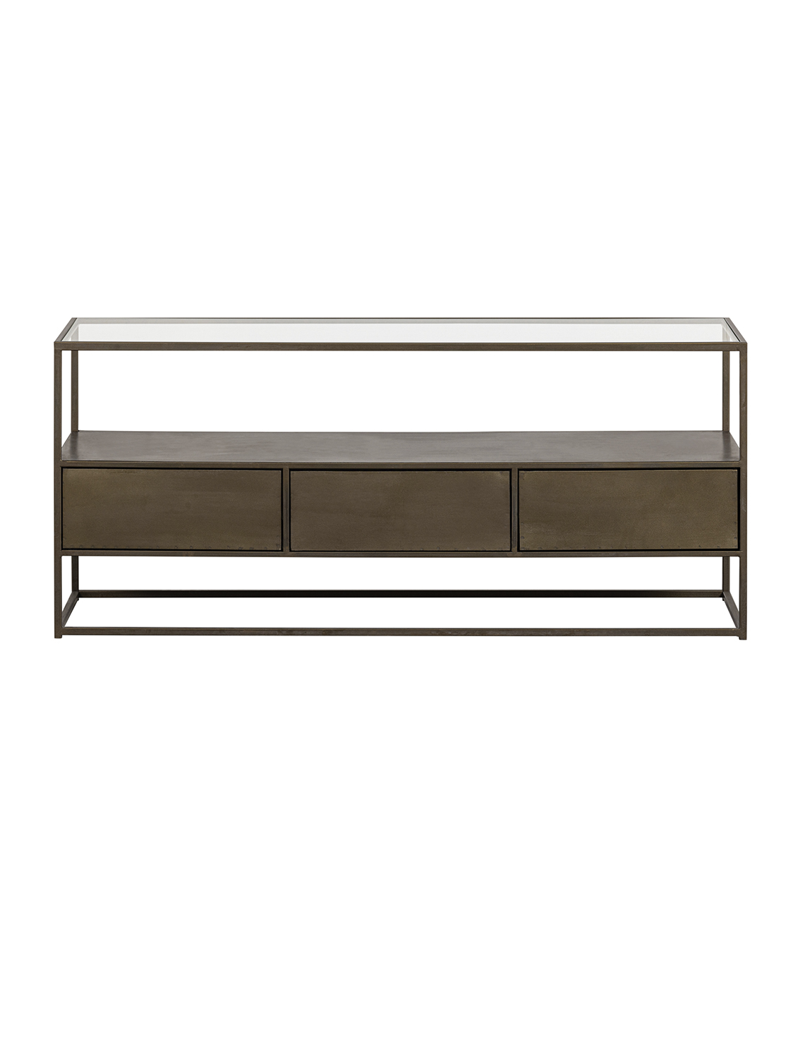 Moderna TV komoda prozračnog dizajna – Izrađena od metala s premazom od antiknog mesinga.Ova stilska TV komoda je iz kolekcije nizozemskog brenda interijera BePureHome i izgleda vrlo prozračno zbog otvorenog dizajna.Antikni mesing daje namještaju istrošeni zlatni izgled. Opremljena s tri ladice i dvije police.
