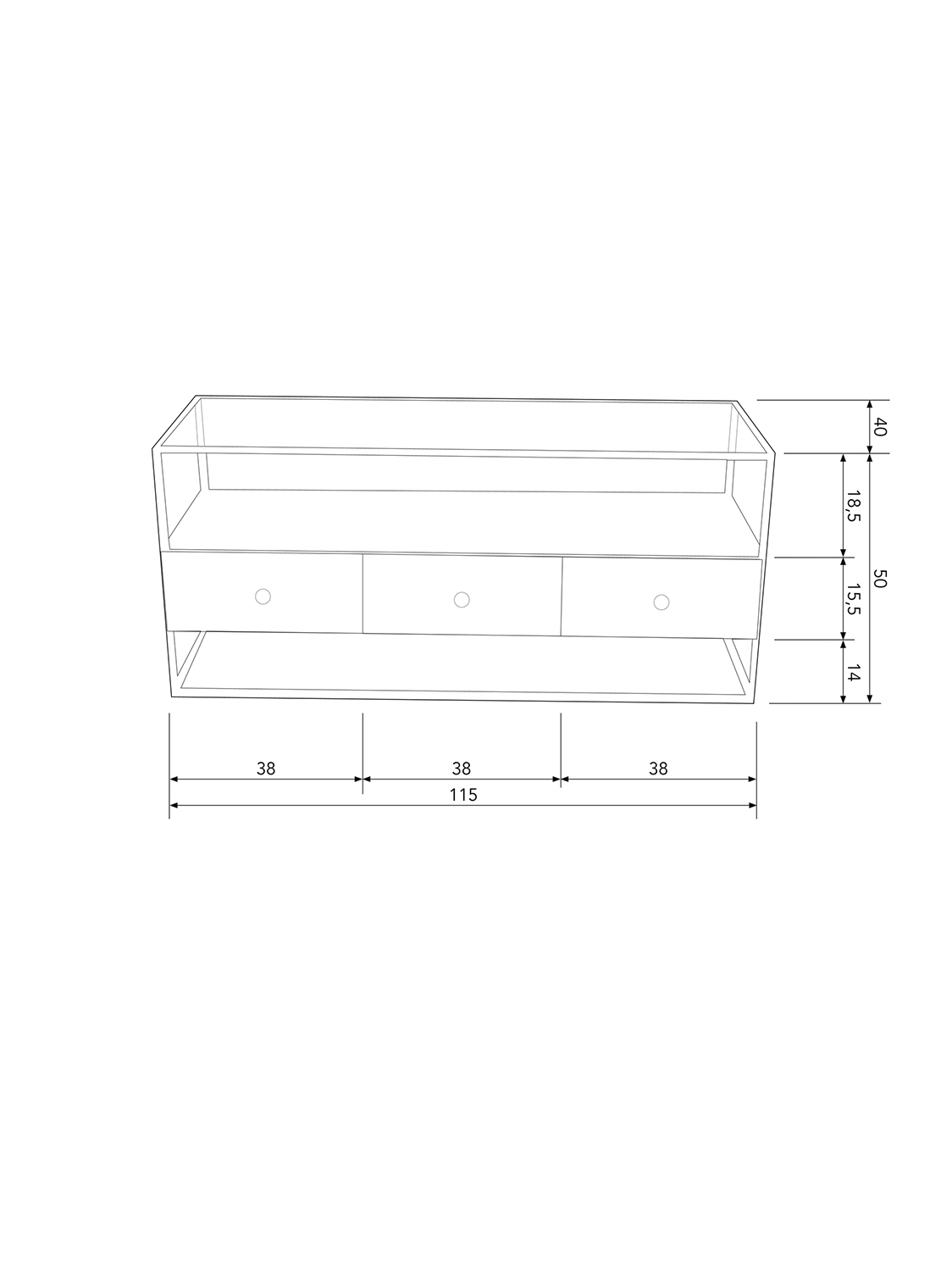 Artikl je visok 50 cm, širok 115 cm i dubok 40 cm. Prozirna staklena polica izrađena je od sigurnosnog stakla i debljine je pola centimetra. Otvoreni pretinac ispod ima visinu od 18,5 cm i može nositi 10 kg kada je ravnomjerno raspoređen. Tri fronte ladice su visine 15,5 cm i širine 38 cm, a kapacitet svake ladice je V14 cm x Š35 cm x D39 cm. Razmak između dna i poda je 14 cm, a okvir jedinice ima kvadratni centimetar i pol. Gornji dio može nositi 8 kg, a svaka ladica ima maksimalnu nosivost od 5 kg.