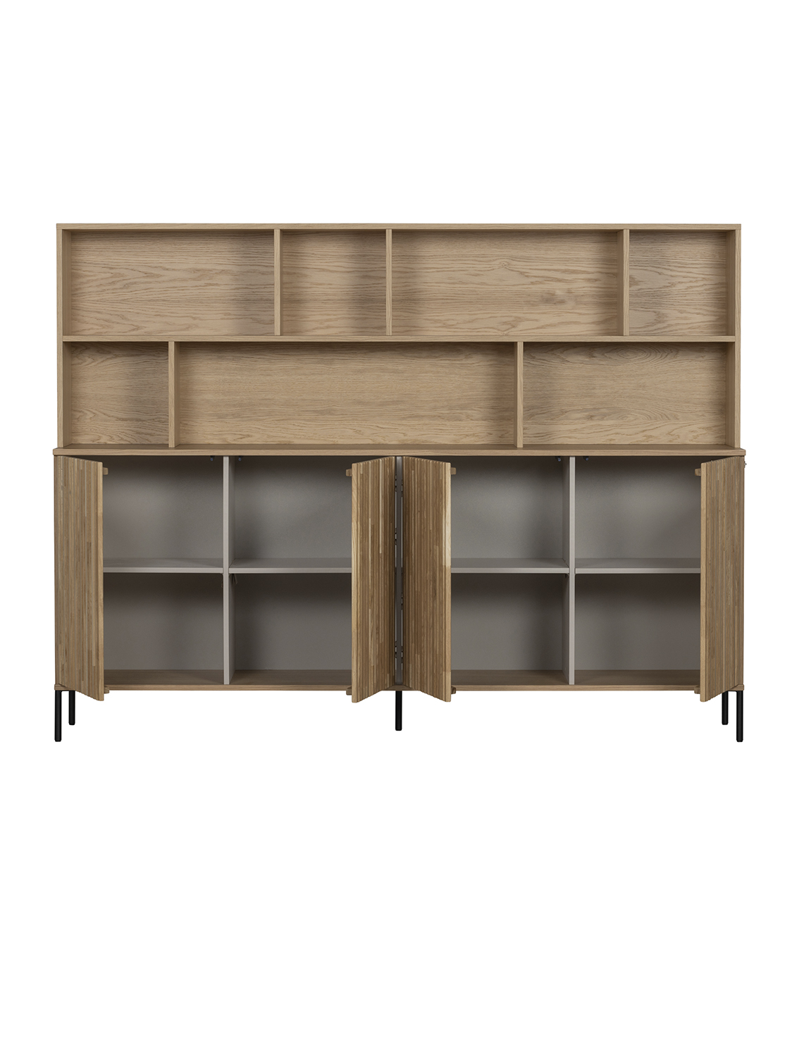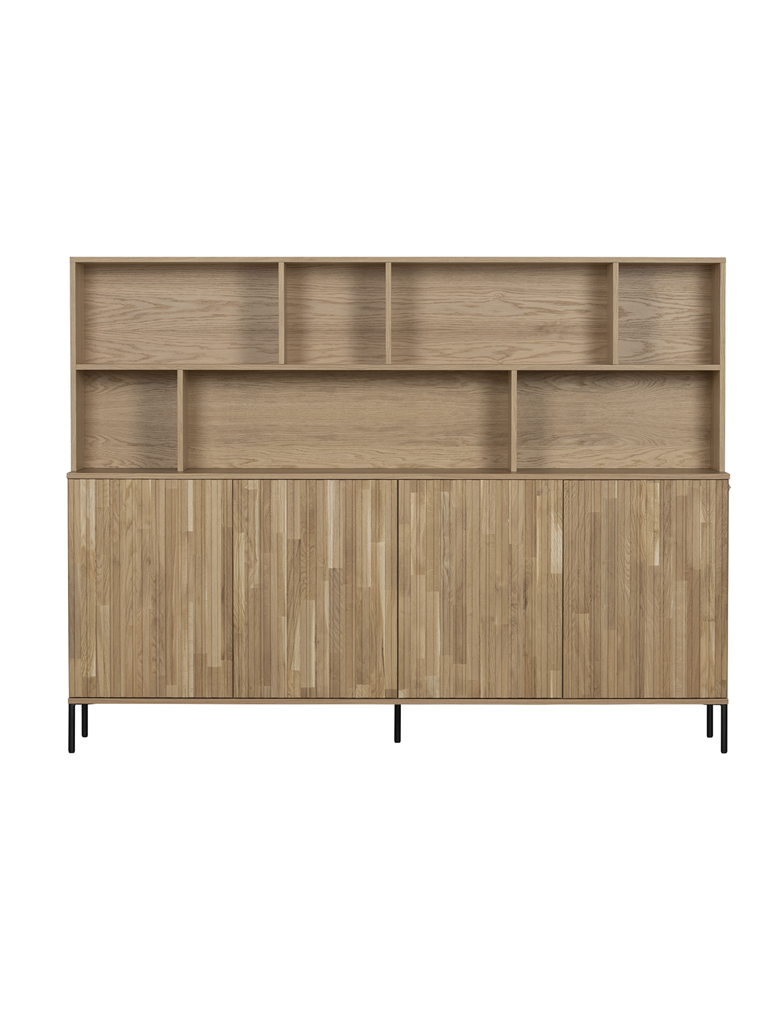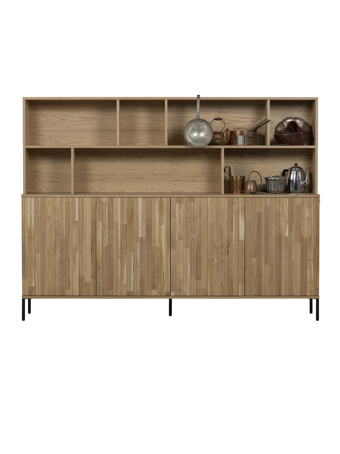 Jedinstveni dodatak New Gravure komodi iz kolekcije nizozemskog brenda za dizajn interijera WOOOD, New Gravure zidni ormarić. Zidni ormarić izrađen je od hrastovog furnira prozirnog bajca. Predložite svoje najljepše predmete za dom u ormarić u pretinac i otkrijte more prostora za pohranu iza četiri reljefna vrata.
