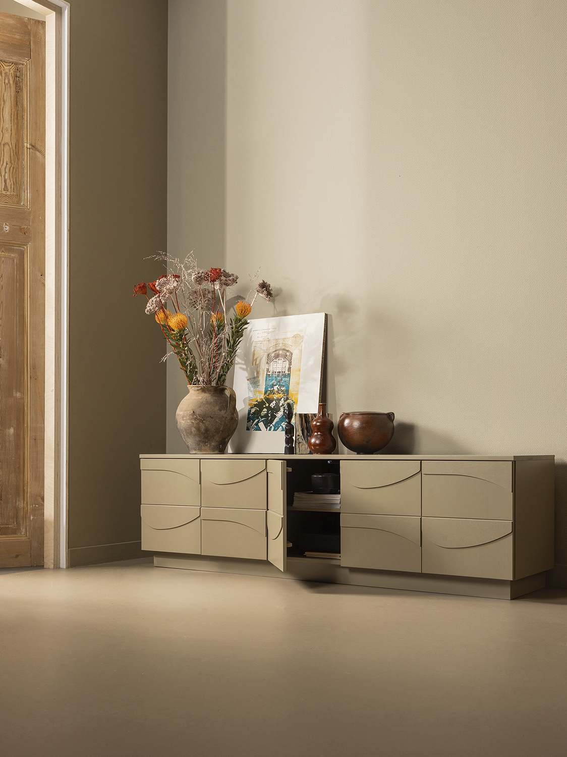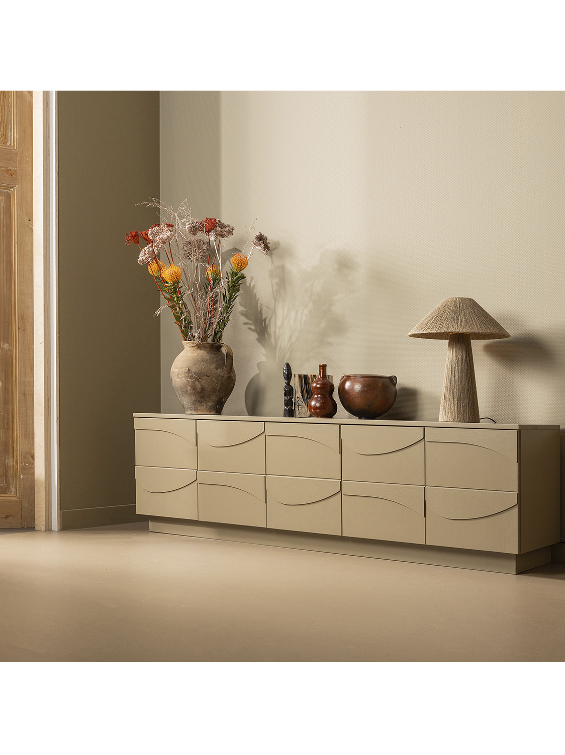 Organski oblici i razigrani 3D efekt, karakteristike su najnovijih životnih trendova. Teo komoda u potpunosti obuhvaća ove karakterne osobine. Dizajnirana je i proizvedena za Exclusive kolekciju nizozemskog branda interijera WOOOD i izrađena je od 100% FSC certificiranog bora s prekrasnim, zemljanim tonom.