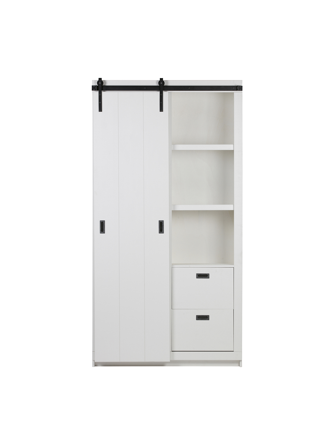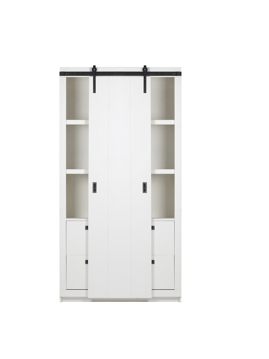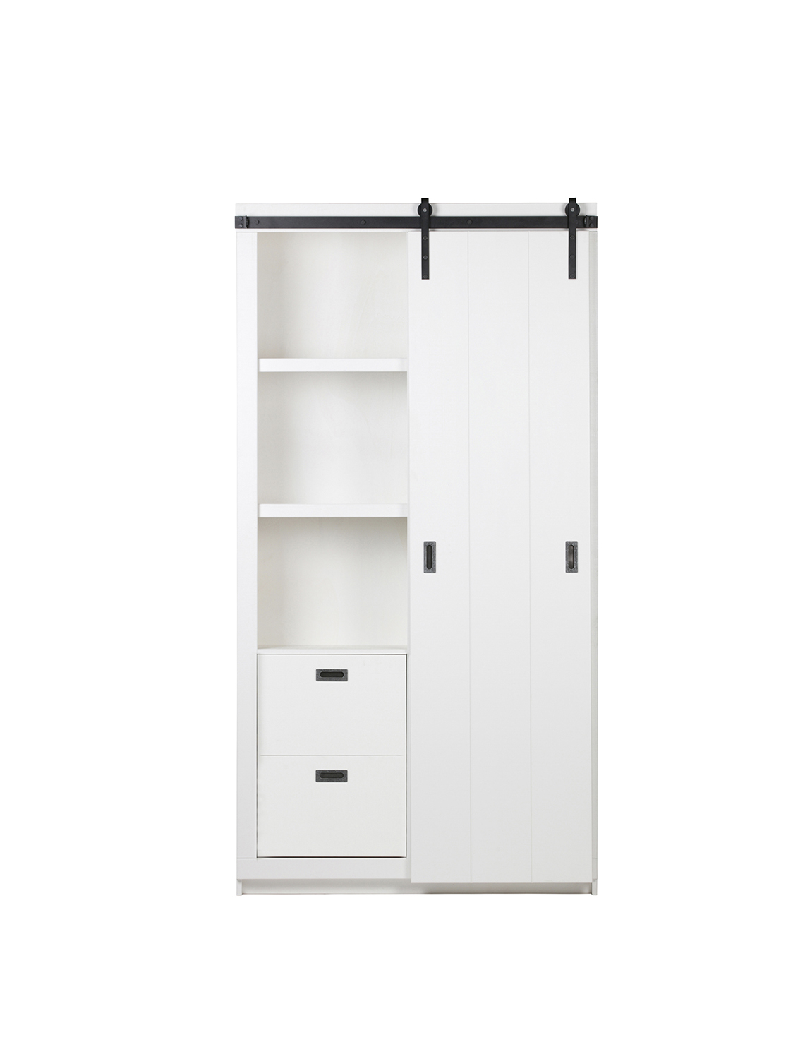 Ovaj ormarić Slide Barn sve je samo ne standardno spremište ili polica za knjige. Barn je ormar s mogućnostima. Možete dati vlastitu interpretaciju. Ormar ima dvije strane podijeljene na dvije debele police i 2 ladice na dnu, jedna strana uvijek vidljiva, a druga strana pokrivena kliznim vratima. Klizna vrata u metalnoj tračnici stoga se mogu pomicati s desna na lijevo. Ormarić je izrađen od punog FSC certificiranog bora, a korišteno drvo je grubo piljeno.