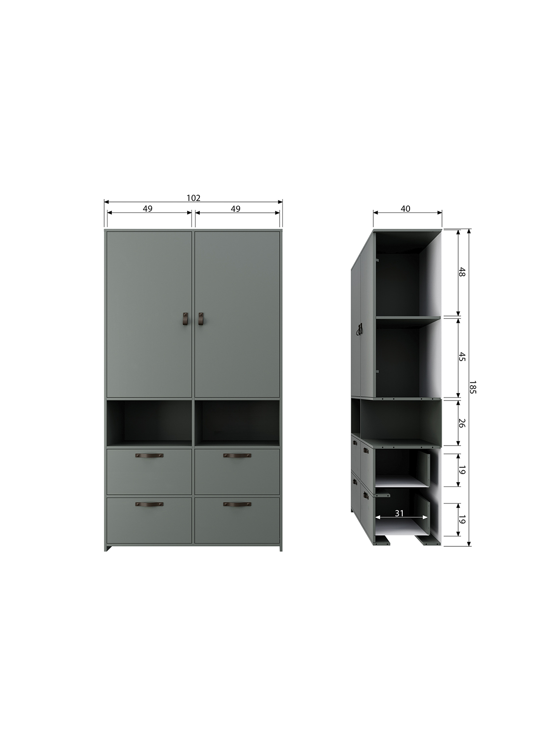 Ormar ima dvoja vrata ormara širine 49 cm. Iza ovih vrata nalazi se jedna polica preko cijele širine ormara. Donji pretinac ima visinu od 45 cm, a pretinac iznad ugrađene police ima visinu od 48 cm. Na dnu ormar ima 4 ladice (V 19 x Š 49 X D 31 cm) sa smeđom kožnom ručkom.
