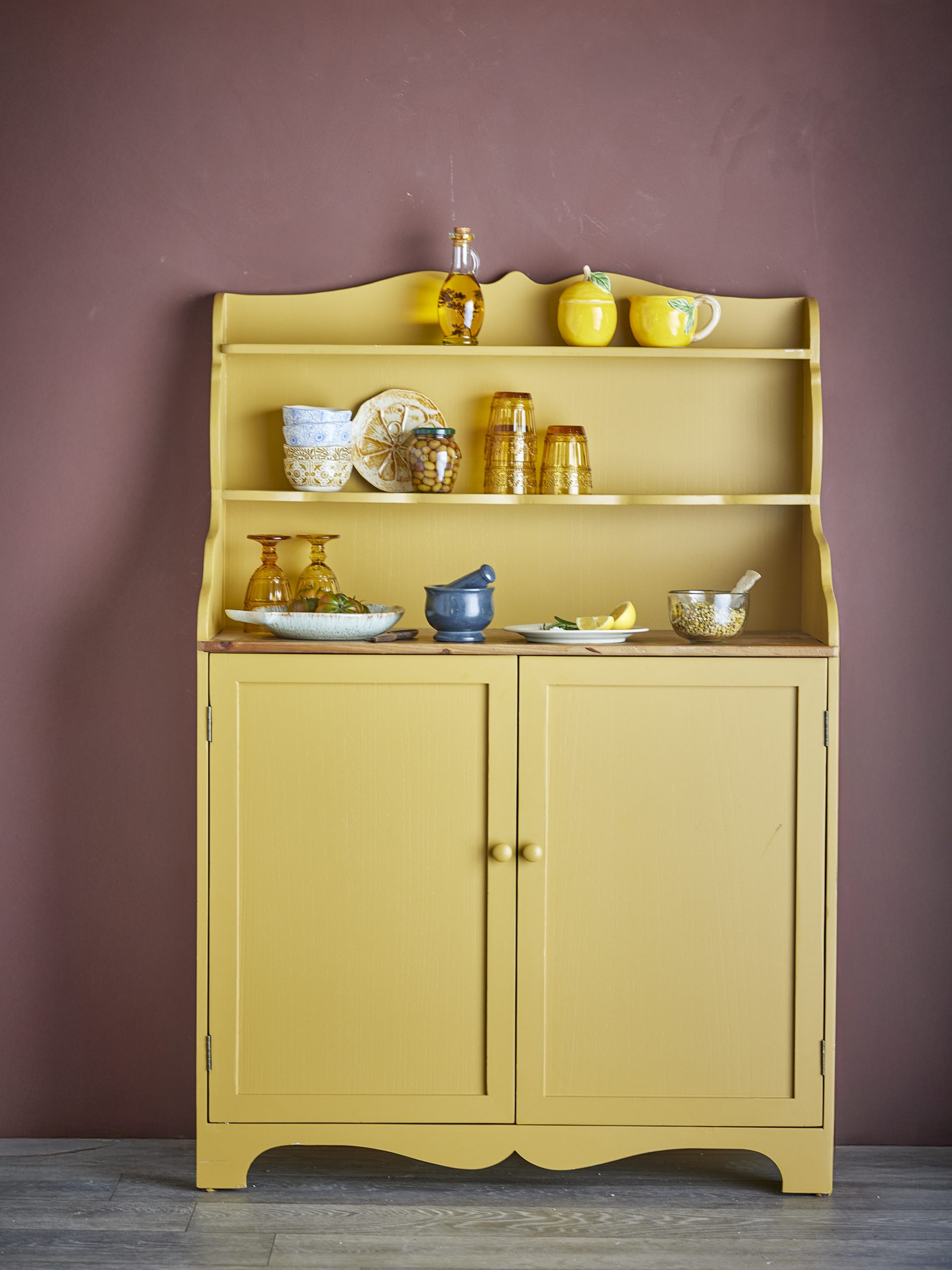 Libby ormarić tvrtke Creative Collection izrađen je od bora i MDF-a te obojan u toplu žutu nijansu s laganom patinom. Zaobljeni profil i kombinacija otvorenih polica i zatvorenih ormarića čine ga idealnim za izlaganje i pohranu.
