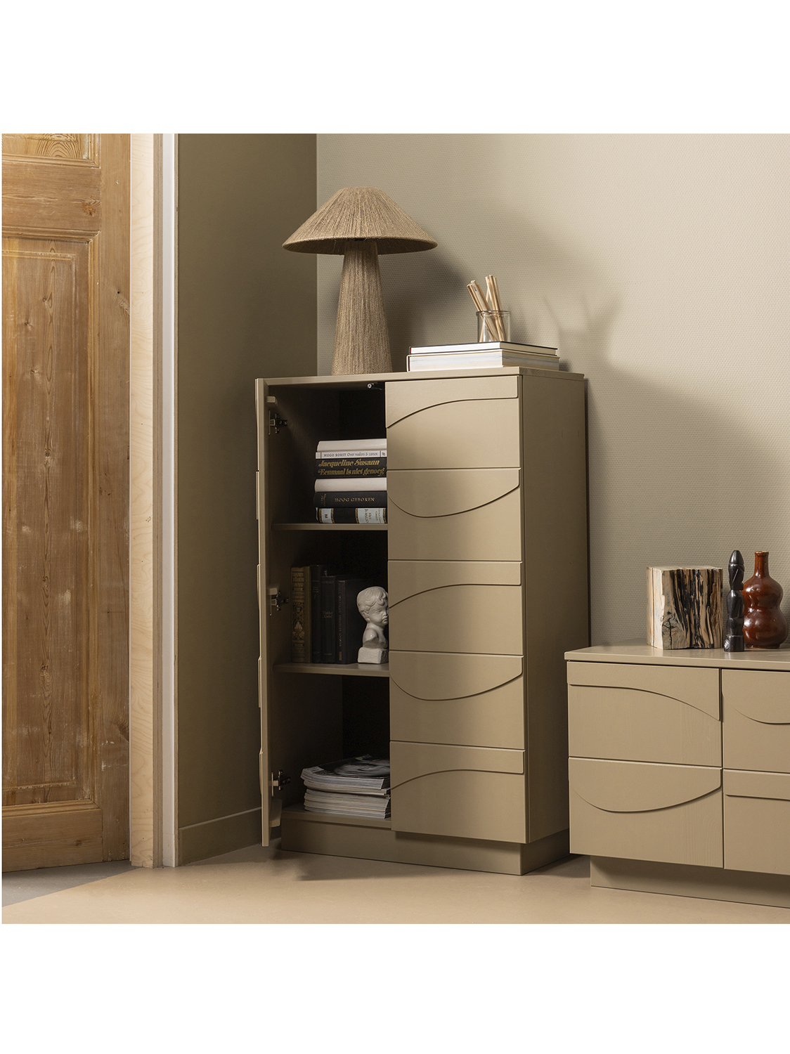 Teo ormarić je dizajniran i proizveden za Exclusive kolekciju nizozemskog branda interijera WOOOD i izrađen je od 100% FSC certificiranog bora s prekrasnim, zemljanim tonom.Organski oblici i razigrani 3D efekt, karakteristike su najnovijih životnih trendova. Serija Teo storage u potpunosti obuhvaća ove karakterne osobine.