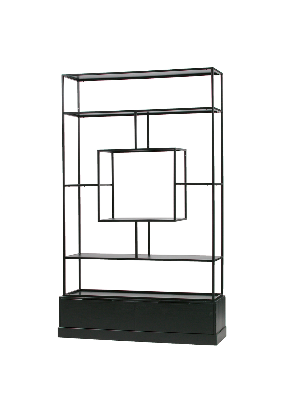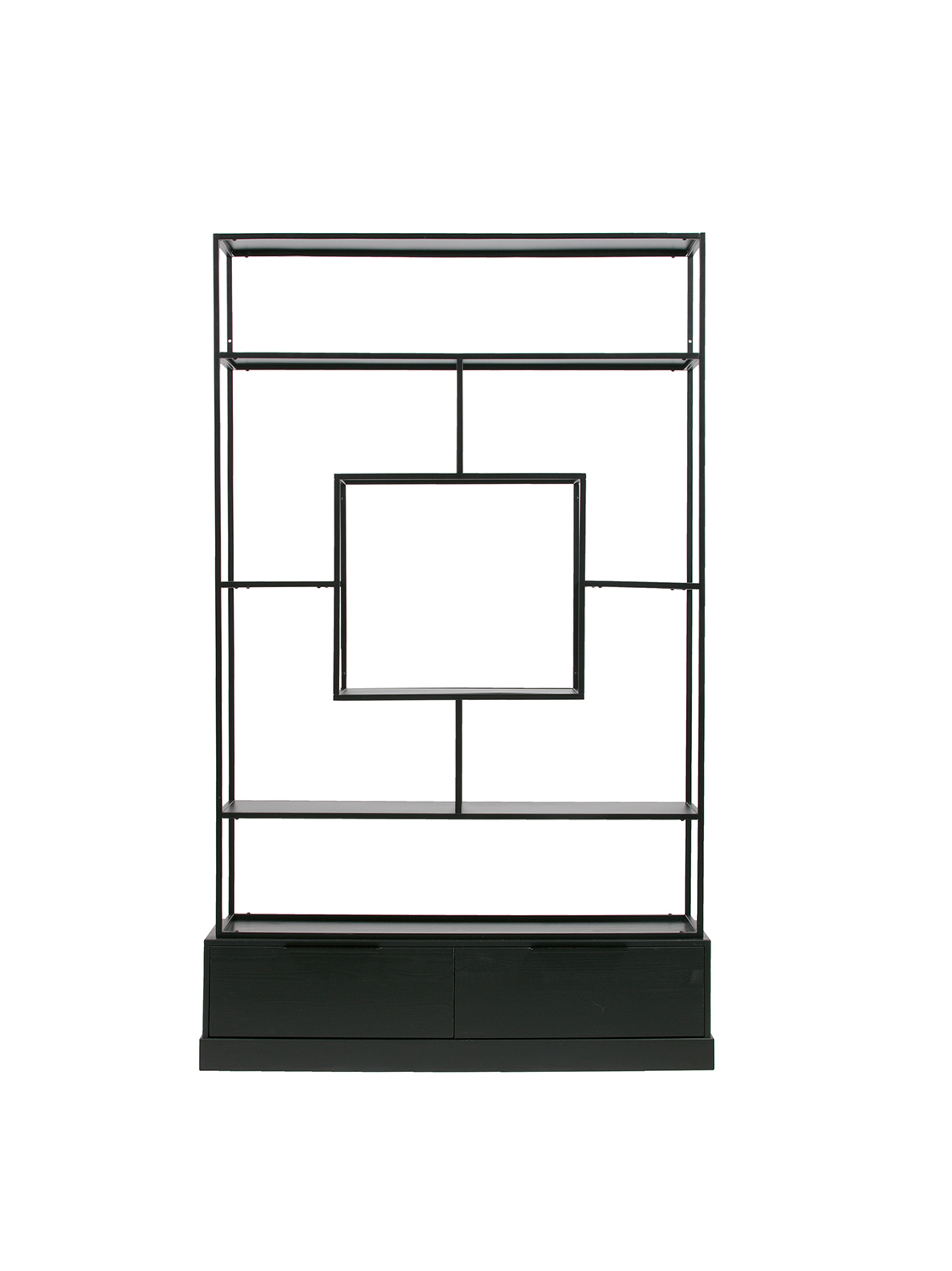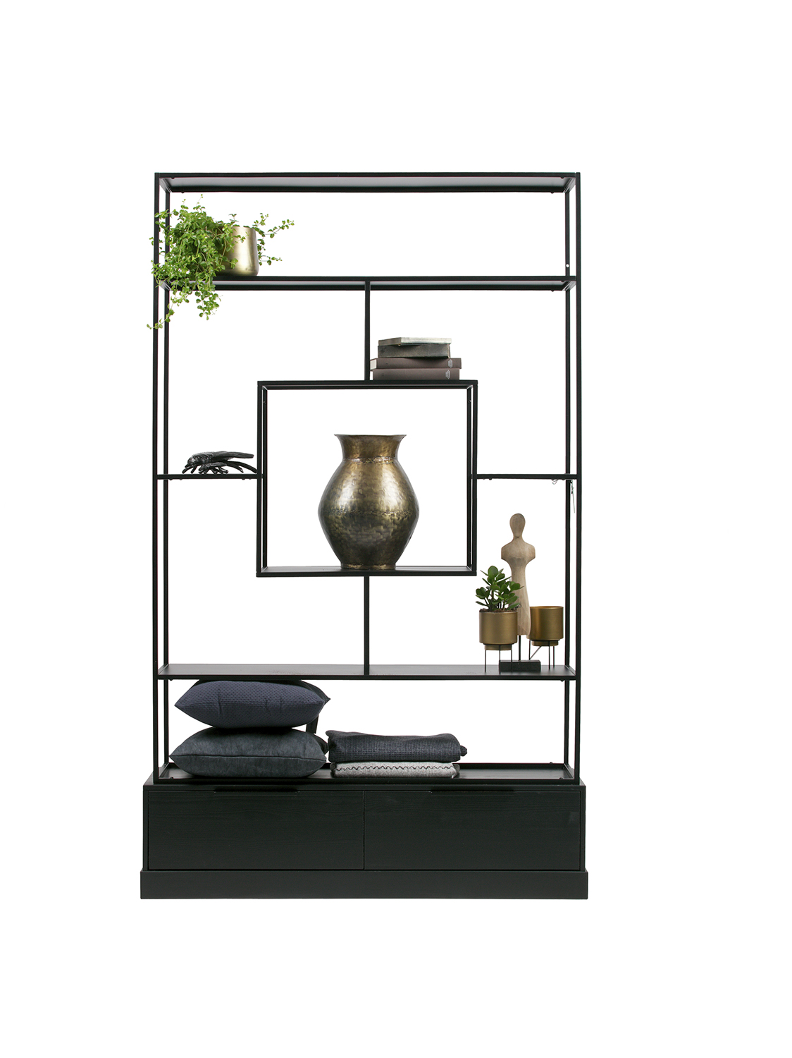 Stalaža Fons jedinstvenog izgleda, brenda WOOOD Exclusive, sastoji se od metalnog okvira, crno lakiranog, u kombinaciji s dvije ladice od brušenog crno lakiranog bora. Može se koristiti i kao pregrada između prostorija!