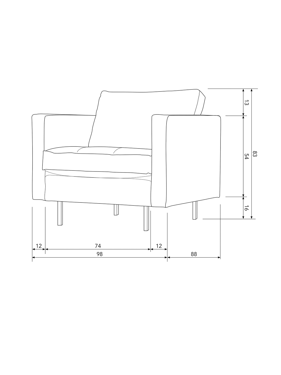 Ležaljka Rodeo Classic ima ukupnu visinu od 83 cm, širinu od 98 cm i dubinu od 88 cm. Visina sjedala je 47 cm, a dubina sjedala 58 cm, što pruža udoban položaj za sjedenje koji pruža podršku. Širina sjedišta ove fotelje je 76 cm i ima labavi jastuk za sjedalo i naslon. Nasloni za ruke imaju širinu od 12 cm i visinu od 70 cm, mjereno od poda. Metalne noge su visoke 16 cm. Sofa može nositi 120 kg kada je ravnomjerno raspoređena.