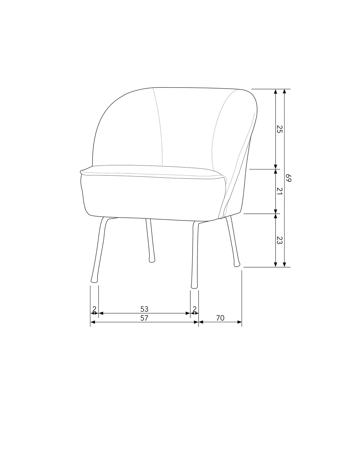 Fotelja Vogue ima ukupnu visinu od 69 cm, ukupnu širinu od 57 cm i dubinu od 70 cm. Visina sjedala je 44 cm, a dubina sjedala 54 cm. Širina sjedala je 54 cm. Dvije prednje noge su visoke 25 cm, stražnje 22,5 cm, a sve četiri imaju promjer 2 cm.
