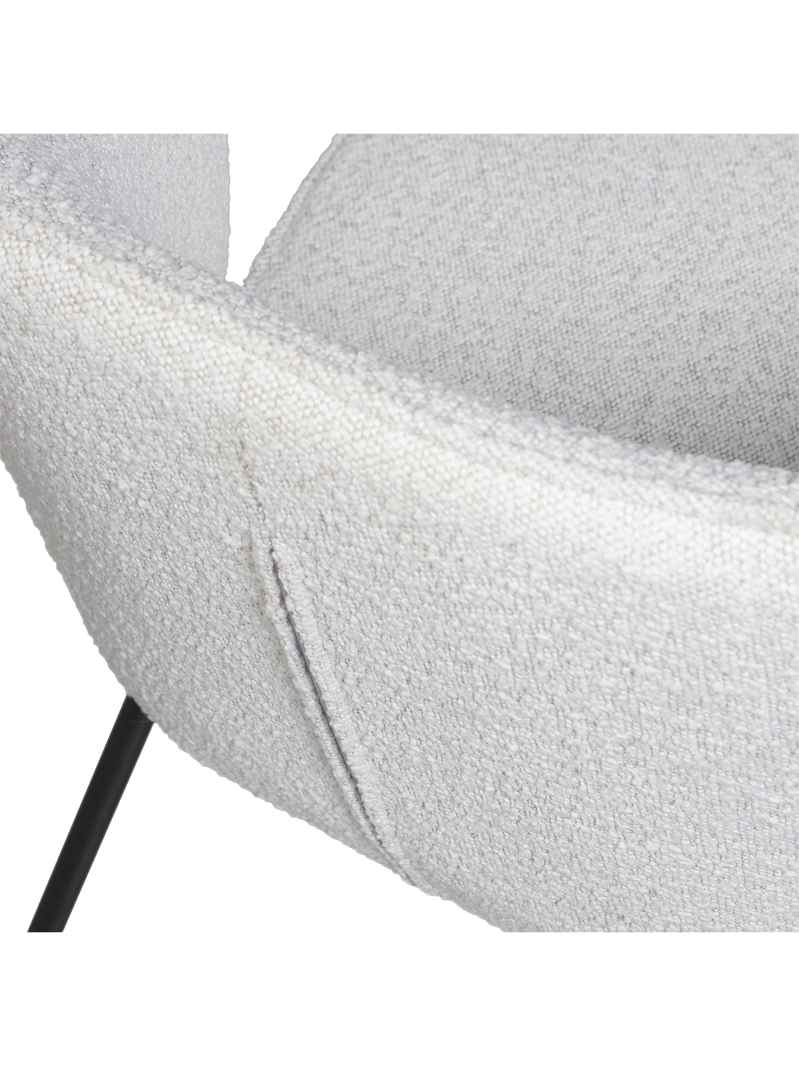 Udobna stolica luksuznog izgleda ,okruglih oblika sa Bouclé presvlakom (100% poliester) i metalnom bazom . Bouclé presvlaka zadržava oblik koji pristaje zahvaljujući dva šava na naslonu i patentnom zatvaraču na leđima.