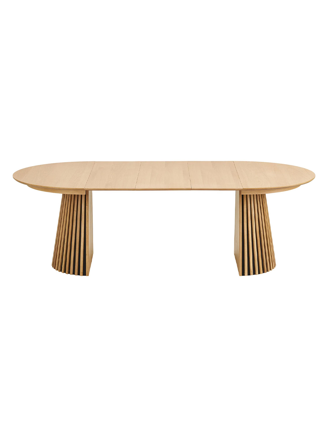 Blagovaonski stol Osaka tvrtke House Nordic od hrastovog furnira savršen je za ugodna okupljanja s obitelji i prijateljima. Prekrasan stol od hrasta, u natur nijansi dodaje toplu atmosferu u prostoriju. Elegantan oblik ploče stola daje stolu moderan i ležeran stil. Stol se može proširit u sredini tako da od okruglog dobijemo ovalni stol za 8 osoba.Produžne ploče su uključene.