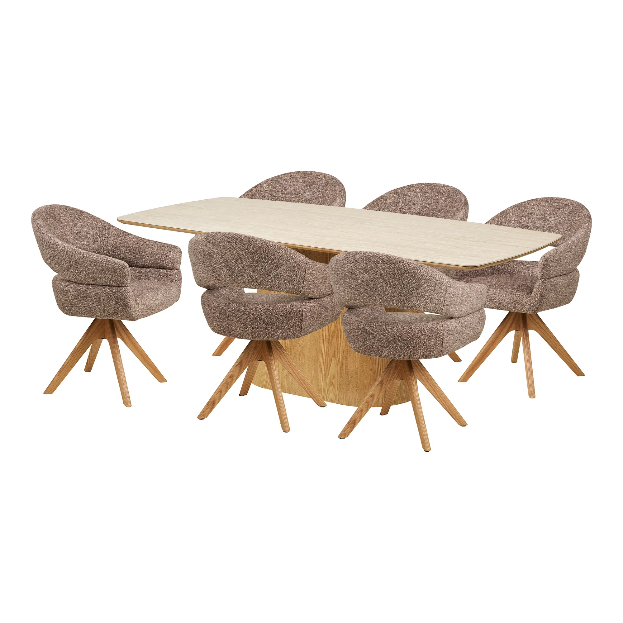 Blagavaonski set Noli sastoji se od stola koji spaja luksuz travertina i toplinu jasena i stolica modernog dizajna s drvenim nogama koje su savršen je spoj elegancije i udobnosti.