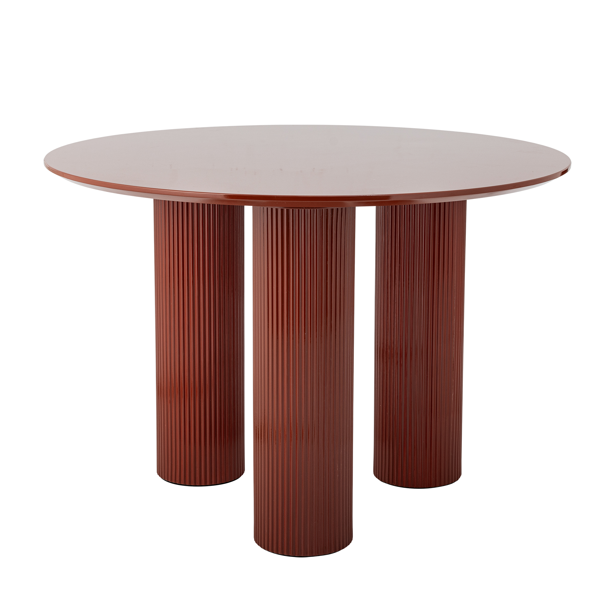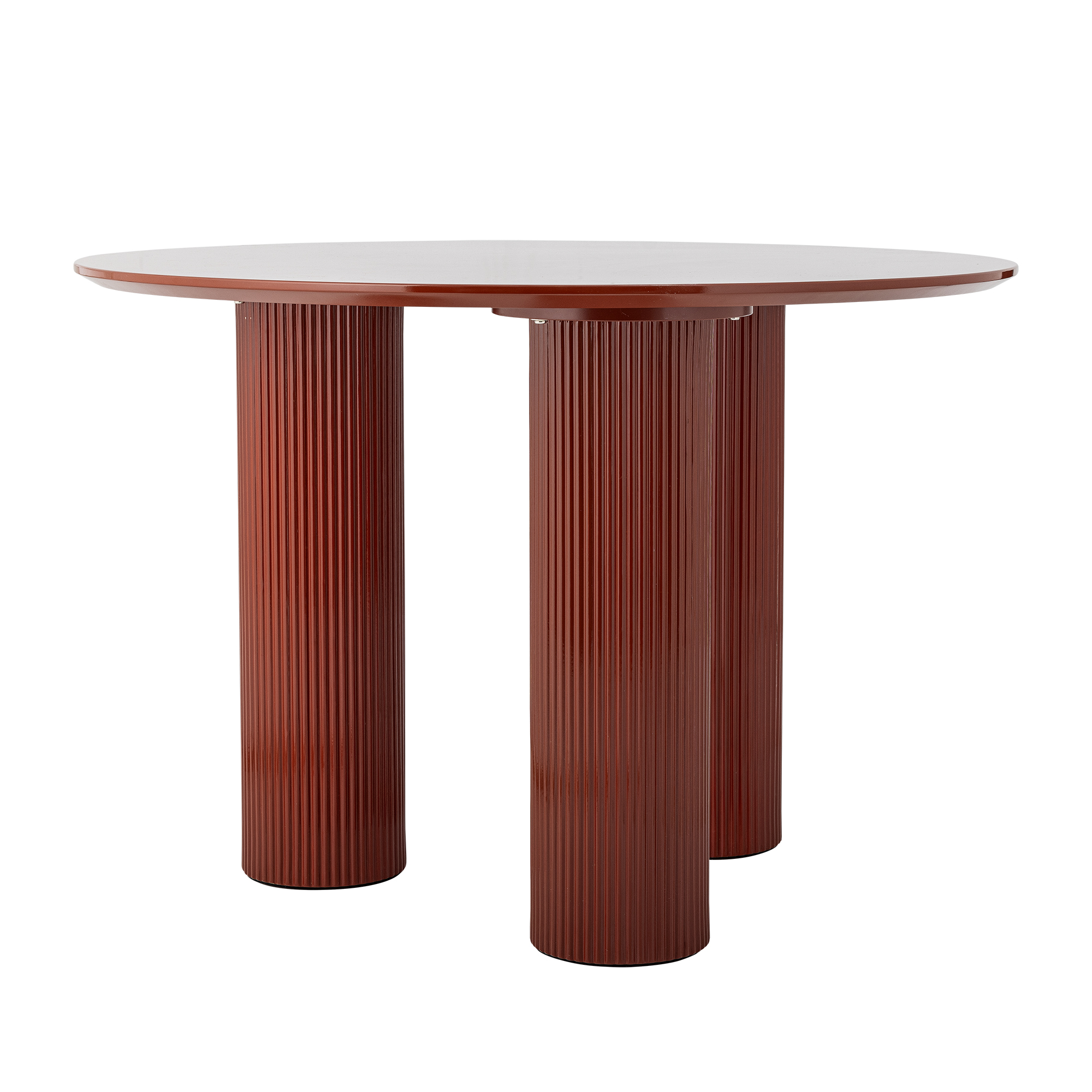 Blagovaonski stol Della tvrtke Bloomingville okrugli je stol s MDF pločom u crvenoj boji, lakiranom u visokom sjaju. Tri cilindrične noge s utorima tvore skulpturalnu bazu, dajući stolu uravnotežen i čvrst izgled s profinjenim, modernim izrazom.