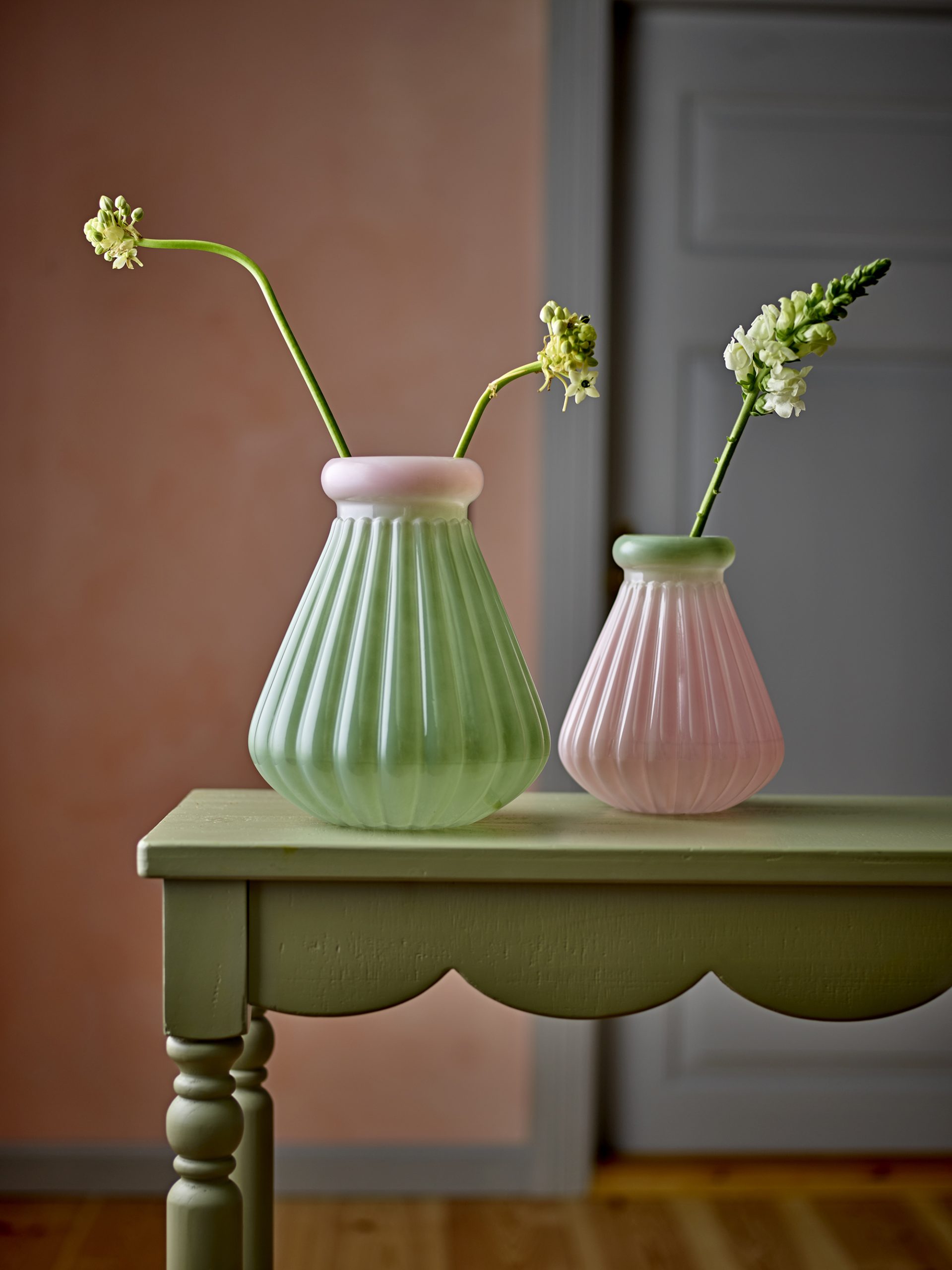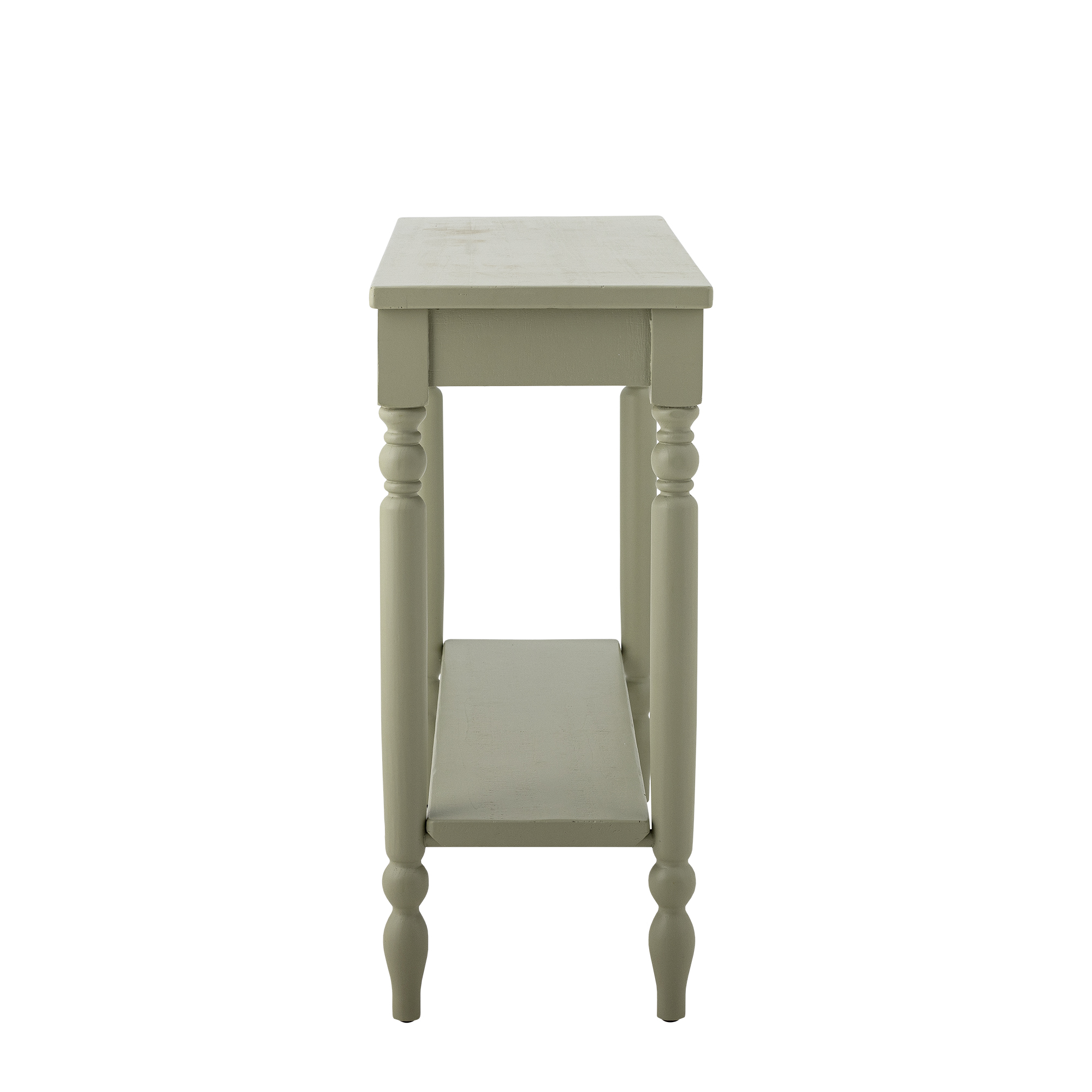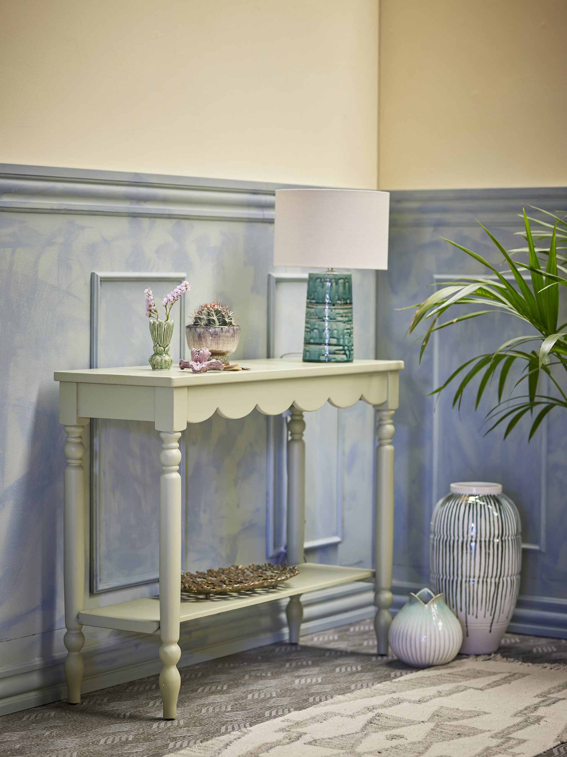 Konzolni stol Salla tvrtke Creative Collection izrađen je od jelovine i obojen u prašnjavo zelenu boju. Valoviti rub ploče stola i dodatna polica daju stolu dekorativan izgled i praktičnu funkcionalnost.