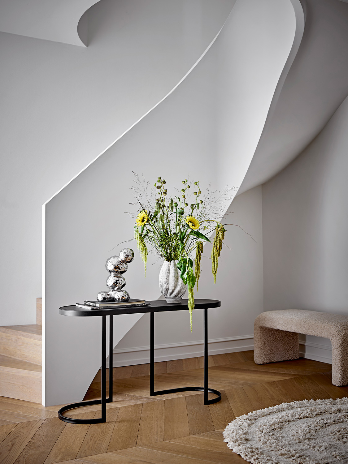 Konzolni stol Carter tvrtke Bloomingville ima minimalistički i bezvremenski dizajn. Ovalna ploča stola i elegantne, geometrijske noge stvaraju elegantan izraz. Stol je savršen za postavljanje iza sofe, u hodniku ili kao samostojeći, središnji element u dnevnoj sobi. Konzolni stol služi i kao dekorativni element i kao funkcionalna površina za izlaganje vaših omiljenih ukrasnih predmeta.
