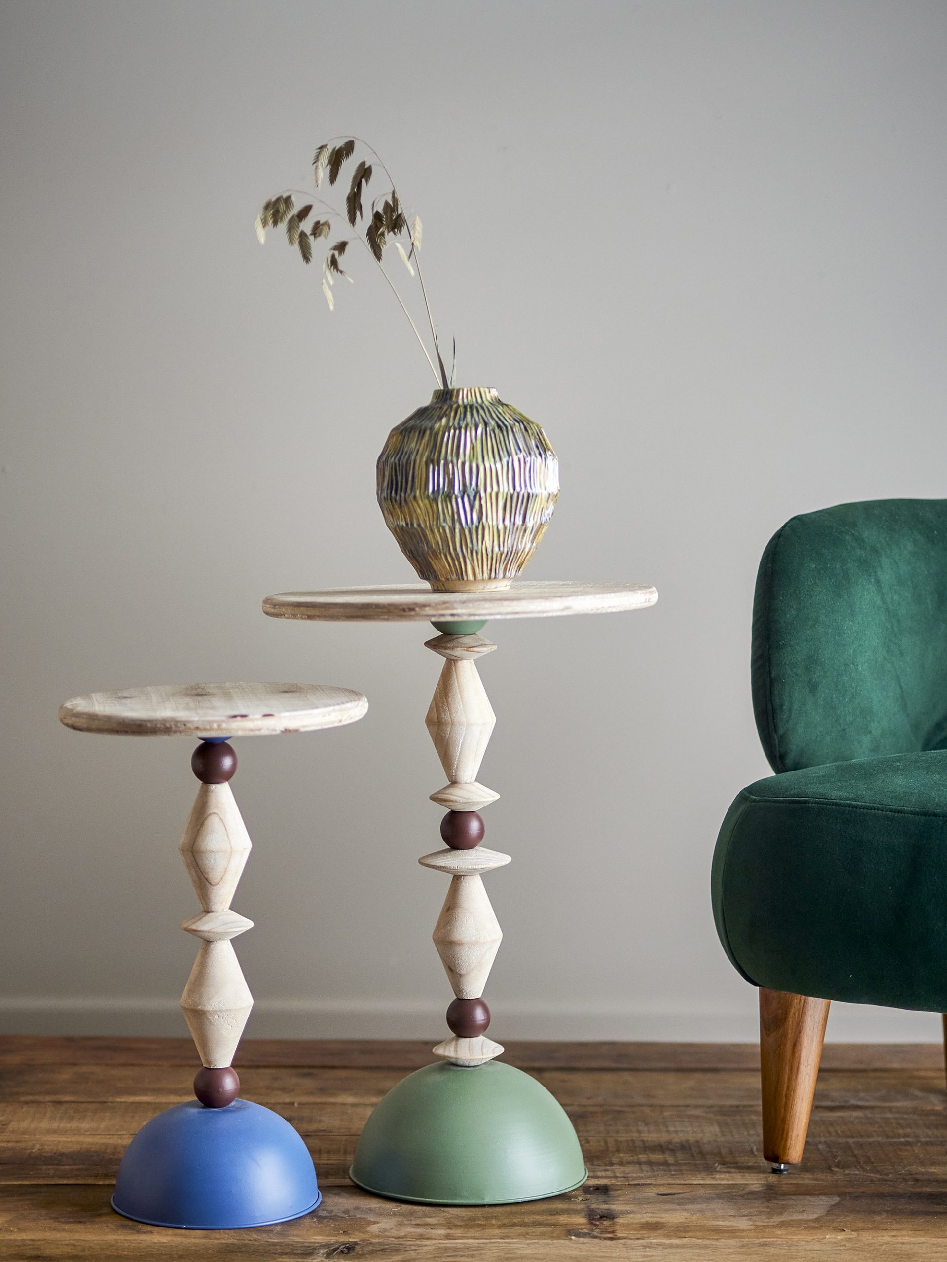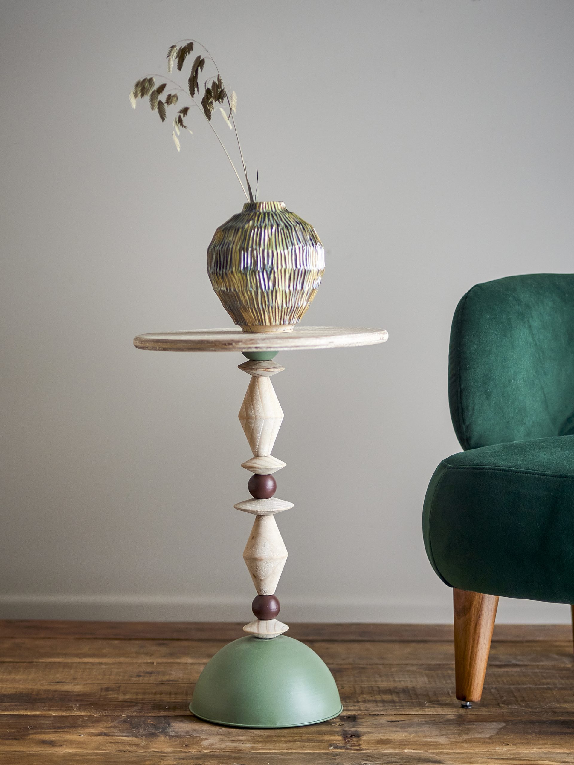 Mannelli bočni stolić tvrtke Creative Collection je skulpturalni dizajn postolja izrađen od jelovine i željeza, završen u prigušenoj zelenoj boji s bijelim premazom. Rezbareni geometrijski detalji i suptilni zeleni i tamnosmeđi akcenti dodaju dubinu.