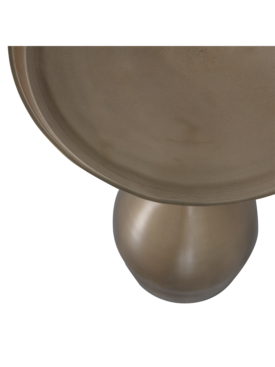Okrugli pomoćni stolić s udubljenom pločom Izrađen od čvrstog metala a završena obrada ima premaz od antiknog mesinga. Unosi u prostoriju dašak prošlog vremena u modernom izadanju.