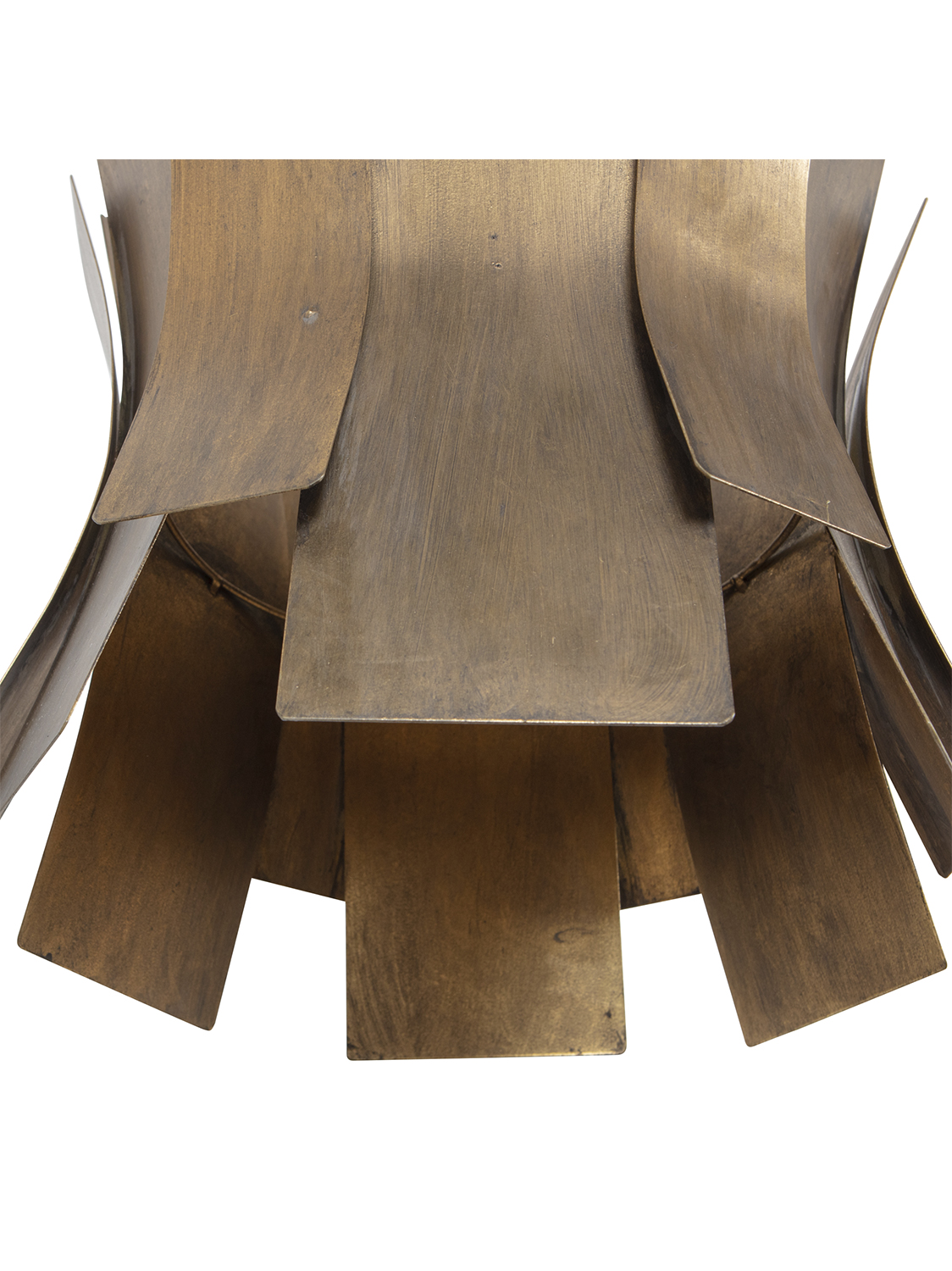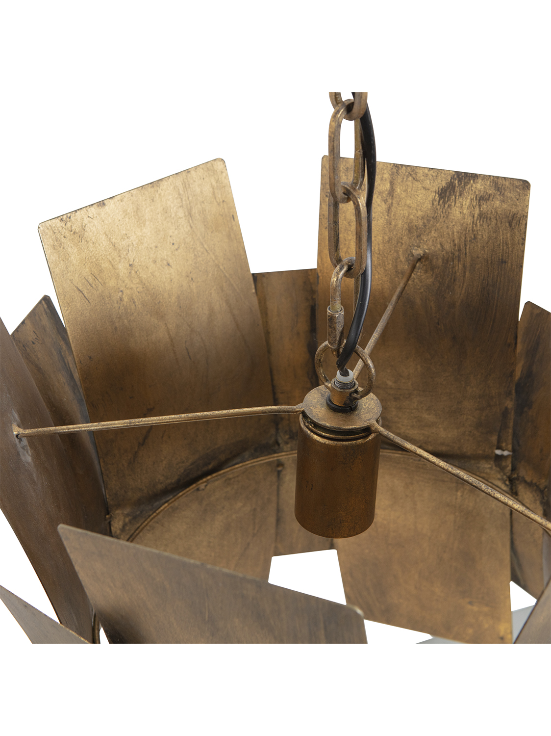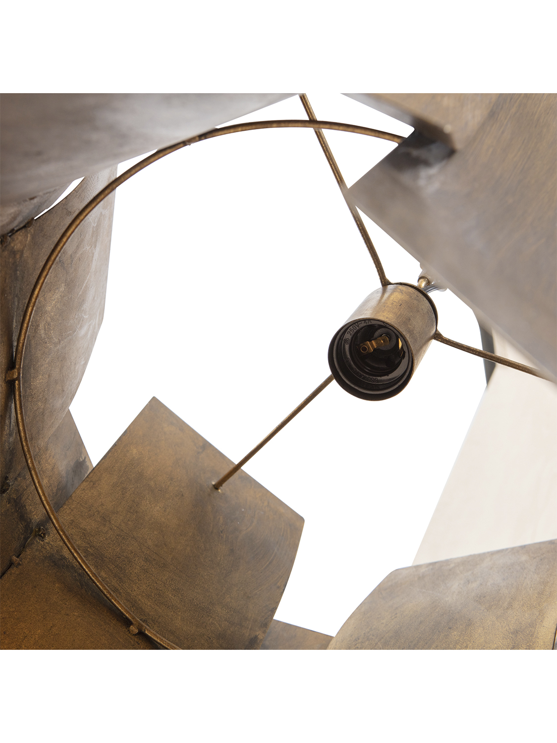 Viseća svjetiljka upečatljivog dizajna, izrađena od metala s premazom od antiknog mesinga.Metalne trake razigranog oblika višestruko odbijaju svjetlost. Jeste li spremni za malo čarolije u mraku?